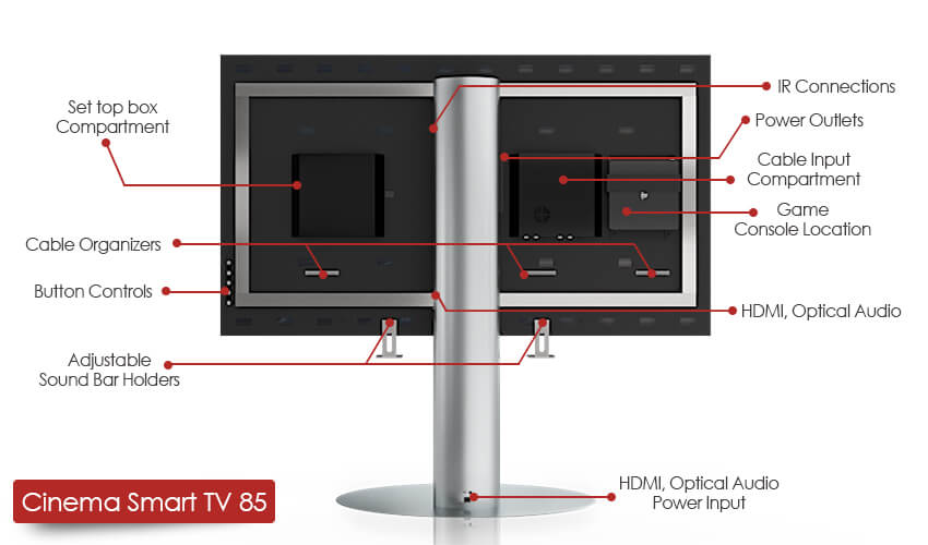 The vertical pole is equipped with an HDMI cable and an Optical Audio cable. Now you can easily connect an extra DVD player, or your audio system without cables and wires hanging around the TV.
