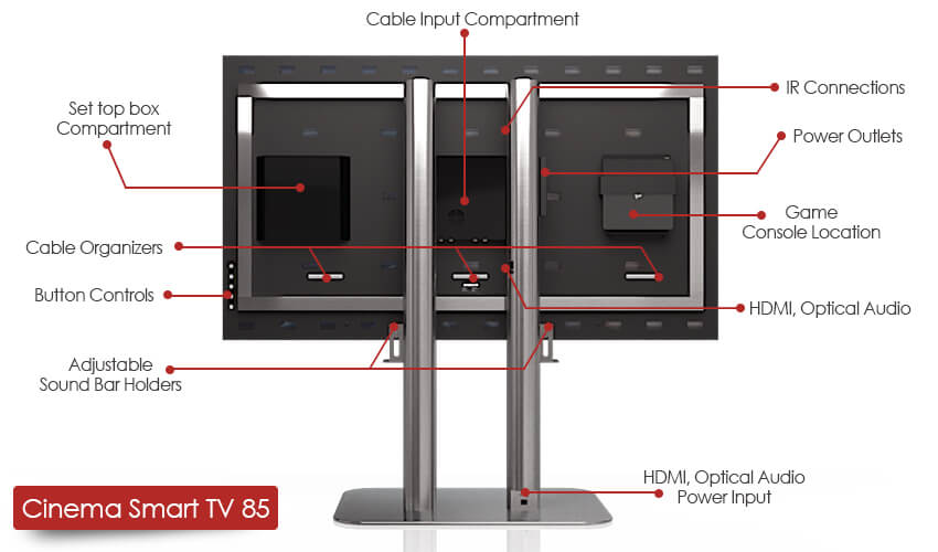 Don’t get distracted by cumbersome wires. Safely tuck away your game console or cable box in a built in niche behind the TV. With Cinema Smart, you can install your favorite game console, such as PlayStation or Xbox. Want to add you’re Infinity or DirecTV box? No problem. Stay simple and well organized with our integrated compartment