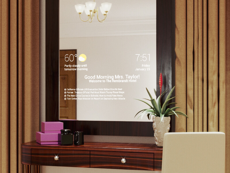 screen, the dressing mirror will provide guests with the latest news, weather and TV shows. With Smart Touch, all apps can be controlled with the touch of a hand. This leaves guests feeling like they have the world at their fingertips.